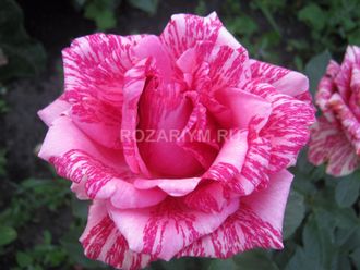 Пинк Интуишн (Pink Intuition) - очень красивая чайно-гибридная роза мраморной окраски - розовые лепестки с бордово-малиновыми полосками. Цветы бокаловидной формы с легка загнутыми лепестками, достаточно крупные в диаметре 10-12 см, густомахровые, с приятным цитрусовым ароматом. Их расцветка напоминает структуру мрамора. Кусты средней колючести с ярко-сочной листвой, в высоту до 110 см. Сорт очень устойчив к болезням и морозостоек. Бокаловидная форма цветка, с слегка загнутыми наружу лепестками и насыщенной яркой листвой.